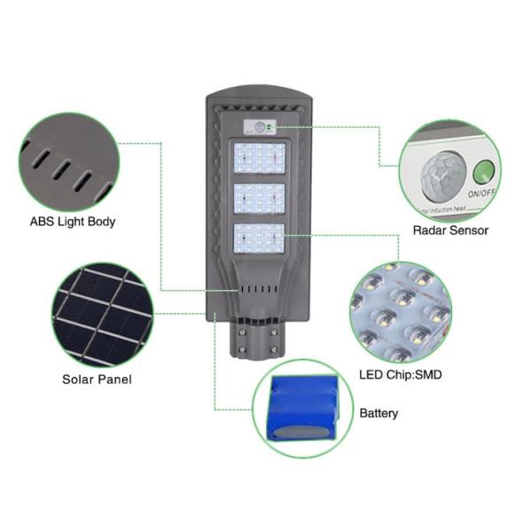 | SST60 | 60W | 6V/15W | 3.2V/15AH | 2800K-6500K | IP65 | ABS Shell+PC Lampshade | 2 Years |